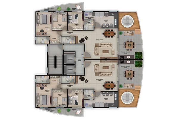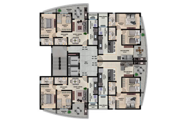 Apartamentos com planta moderna e sofisticada, de 65m2, 62,90m2 e 61,76m2 focados em conceitos de aproveitmento inteligente de espaço e coberturas diferenciadas de 132,07m2 com amplo espaço e vista maravilhosa.